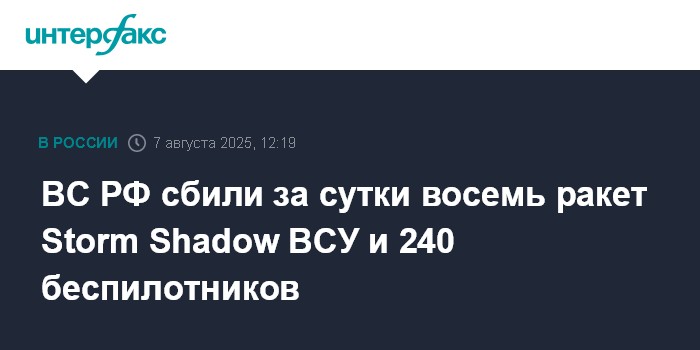 ВС РФ сбили за сутки восемь ракет Storm Shadow ВСУ и 240 беспилотников