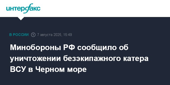 Москва. 7 августа. INTERFAX.RU - Российские военные около 14:50 по московскому времени уничтожили безэкипажный катер вооруженных сил Украины в акватории Черного моря, заявили в Минобороны РФ в четверг.