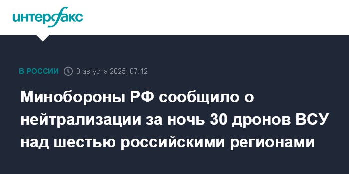 Москва. 8 августа. INTERFAX.RU - Российские военные перехватили и уничтожили в ночь на пятницу 30 украинских беспилотников над шестью регионами России, сообщило Минобороны РФ.