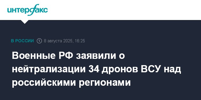 Москва. 8 августа. INTERFAX.RU - Российские военные заявили, что с 12:00 до 15:00 по московскому времени пятницы уничтожены и перехвачены 34 украинских беспилотника.