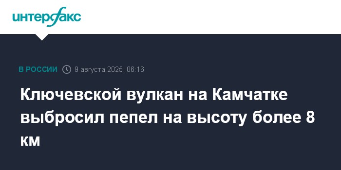 Москва. 9 августа. INTERFAX.RU - Ключевской вулкан на Камчатке выбросил столб пепла на высоту 8,5 км утром в субботу, сообщает Камчатская группа реагирования на вулканические извержения (KVERT) Института вулканологии и сейсмологии (ИВиС) Дальневосточного отделения Российской академии наук.
