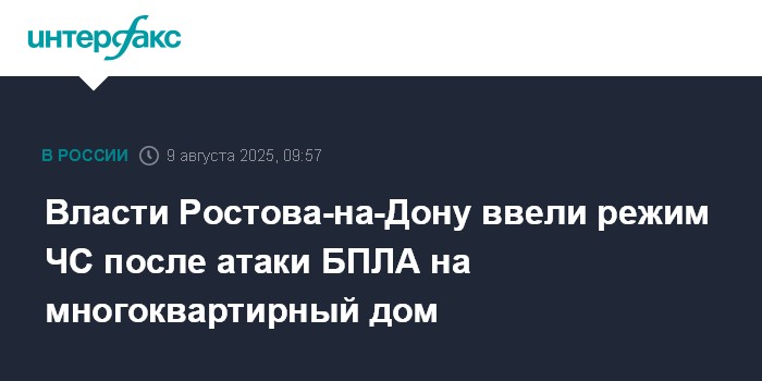 Москва. 9 августа. INTERFAX.RU - Режим чрезвычайной ситуации ввели в Ростове-на-Дону после попадания БПЛА в многоквартирный дом, сообщил глава города Александр Скрябин.