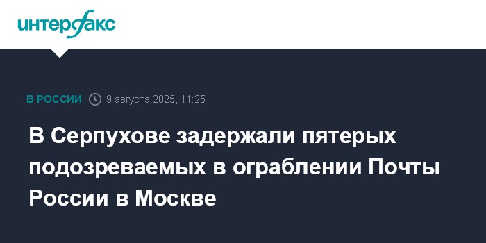 Москва. 9 августа. INTERFAX.RU - В подмосковном Серпухове задержали пятерых подозреваемых в похищении 4,8 млн рублей из отделения Почты России на юге Москвы, сообщила официальный представитель МВД России Ирина Волк в телеграм-канале.