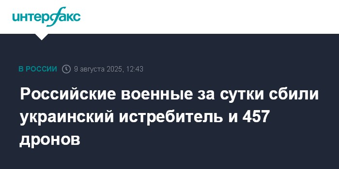 Москва. 9 августа. INTERFAX.RU - Украинский самолет Су-27 и 457 беспилотников ВСУ сбиты за сутки российскими военными, сообщило Минобороны РФ в субботу.