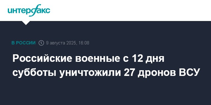 Москва. 9 августа. INTERFAX.RU - Российские средства ПВО в период с 12:00 до 15:30 мск уничтожили 27 украинских беспилотников самолетного типа, сообщило Минобороны РФ в субботу.