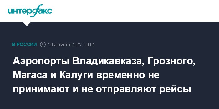 Москва. 9 августа. INTERFAX.RU - Временные ограничения на прием и выпуск воздушных судов введены в аэропортах Владикавказа, Грозного, Магаса и Калуги, сообщил представитель Росавиации Артем Кореняко.