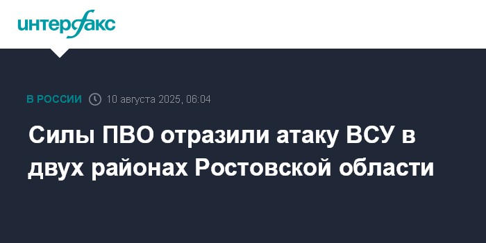 Москва. 10 августа. INTERFAX.RU - Силы ПВО в ночь на воскресенье отразили воздушную атаку ВСУ на Ростовскую область, сообщил врио губернатора Юрий Слюсарь.