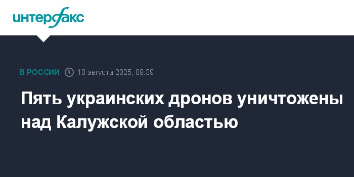 Москва. 10 августа. INTERFAX.RU - Российские военные заявили, что в период с 7:55 до 8:10 уничтожены пять украинских беспилотных летательных аппаратов самолетного типа над территорией Калужской области.
