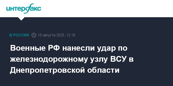 Москва. 10 августа. INTERFAX.RU - Российские военные сообщили, что нанесли удар по железнодорожному узлу в Днепропетровской области, по которому идет переброска украинских войск в Донбасс.