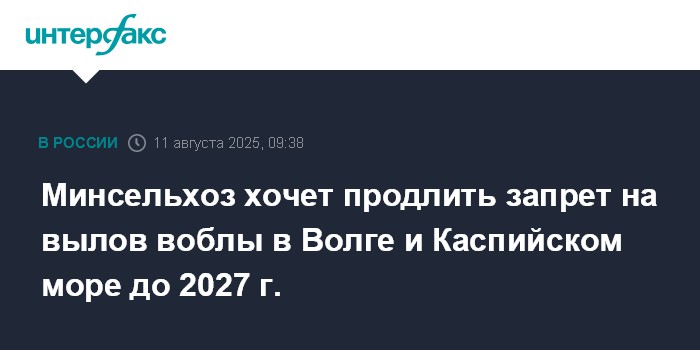 Москва. 11 августа. INTERFAX.RU - Министерство сельского хозяйства РФ предлагает продлить запрет на промышленный и любительский вылов воблы в Каспийском море, а также границах водных объектов Астраханской области и Калмыкии до 31 декабря 2026 года.