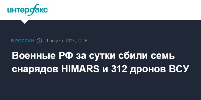 Москва. 11 августа. INTERFAX.RU - Российские военные в течение суток сбили семь реактивных снарядов HIMARS, а также 312 украинских беспилотников самолетного типа, заявили в Минобороны РФ в понедельник.