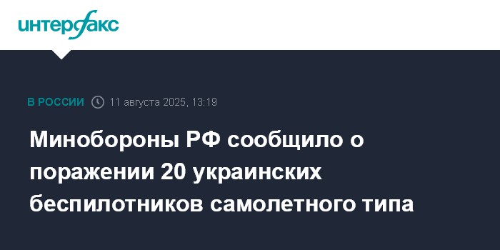 Минобороны РФ сообщило о поражении 20 украинских беспилотников самолетного типа