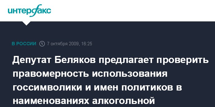 Москва. 7 октября. INTERFAX.RU - Депутат Госдумы Антон Беляков (фракция "Справедливая Россия") считает, что алкогольная продукция не должна продаваться под названиями "Путинка", "ВВП", "Медведев", "Нацпроект". "Предлагаю обратиться в Федеральную антимонопольную службы и Роспатент с тем, чтобы они проверили правомерность использования подобных брендов", - сказал А.Беляков на заседании Госдумы в среду. Он предложил дать соответствующее протокольное поручение комитету Госдумы по экономической политике и предпринимательству "с целью выяснить, правомерным ли является использование государственной символики и имен политических лидеров в наименованиях алкогольной продукции".