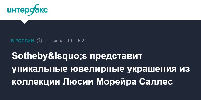 Москва. 7 октября. INTERFAX.RU - Девятого декабря 2009 г. Sotheby‘s выставит на аукцион в Нью-Йорке ювелирные украшения из коллекции бразильской модели и филантропа Люсии Морейра Саллес. Ее карьера началась в Париже в конце 1950-х гг., а уже в начале 1960-х она вдохновляла таких известных модельеров, как Валентино и Коко Шанель, работая эксклюзивно с Шанель. Коллекция Саллес отражает присущую ей элегантность, и представляет классические образцы творений великих дизайнеров ХХ века, таких, как JAR, Cartier, Van Cleef & Arpels, Verdura и Bulgari; украшения поражают великолепием натурального жемчуга и эффектным сочетанием драгоценных камней, впечатляющих цветовой гаммой.