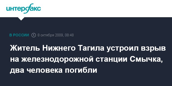 Москва. 8 октября. INTERFAX.RU - ЧП в городе Нижнем Тагиле Свердловской области - в результате взрыва в кабинете на железнодорожной станции Смычка погибли два человека, еще двое госпитализированы.