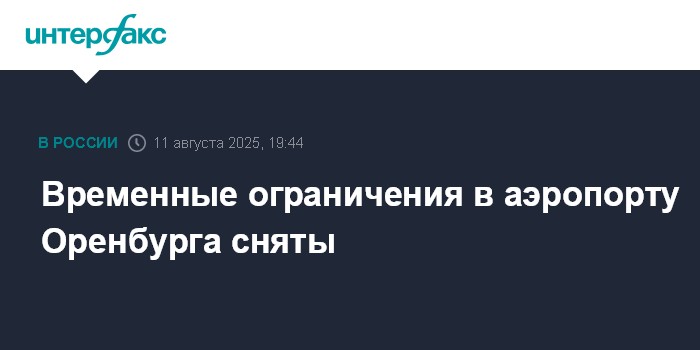 Москва. 11 августа. INTERFAX.RU - Временный запрет на прием и выпуск воздушных судов, введенный ранее в аэропорту Оренбурга, снят, сообщил представитель Росавиации Артем Кореняко.