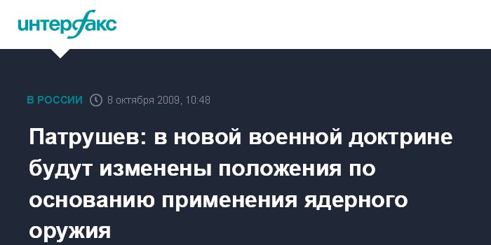 Москва. 8 октября. INTERFAX.RU – В новую военную доктрину войдут изменения в положения по части основания применения ядерного и иного оружия, сообщил в четверг журналистам в Новосибирске секретарь Совбеза РФ Николай Патрушев.