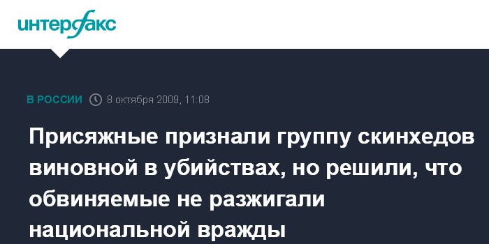 Москва. 8 октября. INTERFAX.RU – Коллегия присяжных Мосгорсуда оправдала четырех москвичей, обвинявшихся в разжигании национальной ненависти и вражды, однако признала их виновными в совершении убийств и покушениях на убийства.
