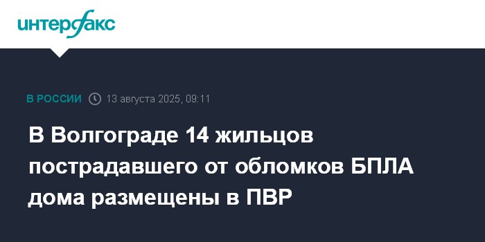 Москва. 13 августа. INTERFAX.RU - В Волгограде после атаки БПЛА 14 жильцов 16-этажного дома в Тракторозаводском районе поселены в пункте врем5енного размещения в школе №3, сообщила мэрия города. Жильцов дома эвакуировали после падения на него обломков беспилотника.