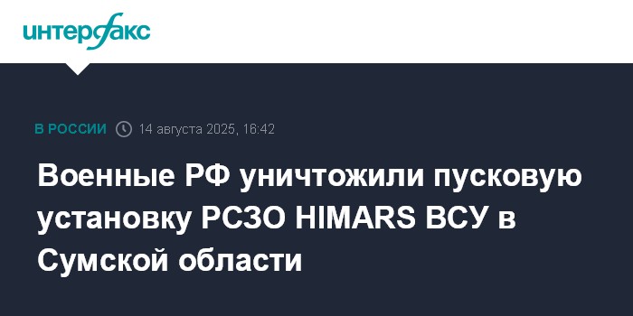 Москва. 14 августа. INTERFAX.RU - Российские военные сообщили, что нанесен ракетный удар комплексом "Искандер" по позиции реактивной системы залпового огня (РСЗО) HIMARS ВСУ в районе населенного пункта Жихово Сумской области.