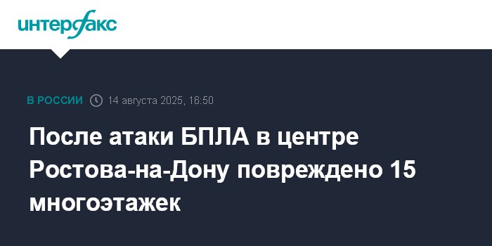 Москва. 14 августа. INTERFAX.RU - После атаки БПЛА на центр Ростова-на-Дону повреждения получили 15 многоквартирных домов, административное здание и частный дом, сообщается на сайте администрации города.