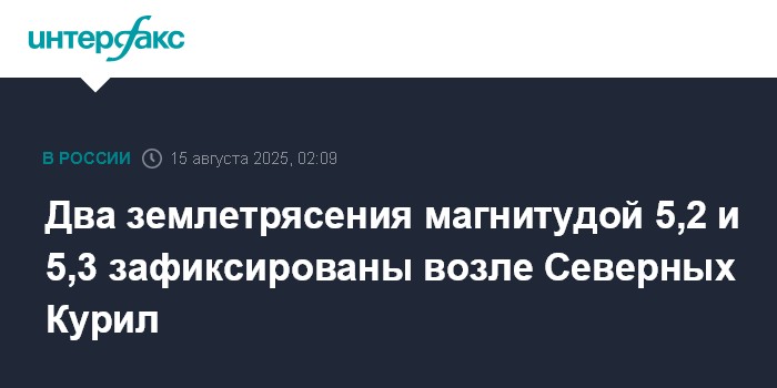 Москва. 15 августа. INTERFAX.RU - Два землетрясения магнитудой 5,2 и 5,3 зарегистрированы утром в пятницу в Тихом океане возле Северных Курил Сахалинской области, сообщили "Интерфаксу" в Сахалинском филиале Единой Геофизической службы РАН.