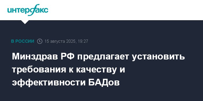 Москва. 15 августа. INTERFAX.RU - Минздрав России предлагает установить комплексные требования к качеству и эффективности биологически активных добавок (БАД); эта мера направлена на улучшение качества продукции и снижение риска негативных последствий для здоровья граждан.