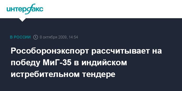 Москва. 8 октября. INTERFAX.RU - Новый российский многофункциональный истребитель МиГ-35 является одним из фаворитов проводимого Индией тендера на закупку 126 боевых самолетов, считает генеральный директор ФГУП "Рособоронэкспорт" Анатолий Исайкин.