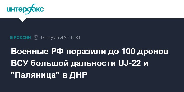 Москва. 18 августа. INTERFAX.RU - Российские военные уничтожили до 100 украинских беспилотников самолетного типа большой дальности UJ-22 и "Паляница" в месте подготовки к запуску в районе населенного пункта Иверское ДНР, заявили в Минобороны РФ в понедельник.