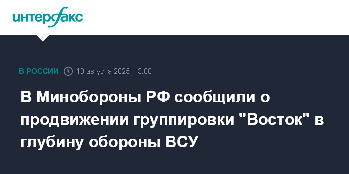 Москва. 18 августа. INTERFAX.RU - Войска группировки "Восток" продвигаются в глубину обороны вооружённых сил Украины, военнослужащие группировки "Центр" заняли более выгодные позиции, сообщило министерство обороны РФ в понедельник.