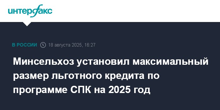 Москва. 18 августа. INTERFAX.RU -Максимальный размер краткосрочного кредита, который будет предоставляться одному заемщику в рамках соглашений о повышении конкурентоспособности (СПК), в 2025 году составит 2 млрд рублей, сообщает сайт Минсельхоза.