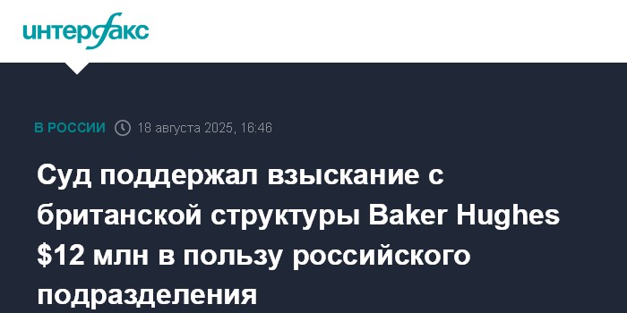 Москва. 18 августа. INTERFAX.RU - Арбитражный суд Московского округа поддержал решение судов нижестоящих инстанций о взыскании с нефтегазовой сервисной компании Baker Hughes Energy Technology UK Limited (Великобритания) в пользу ООО "Бейкер Хьюз Рус Инфра" (Москва) $11,9 млн долга, $97,9 тысячи процентов, а также процентов по статье 395 Гражданского кодекса России, начисляемых на $11,9 млн за период с 26 октября 2024 года по дату фактической оплаты денежных средств, и 6,3 млн рублей госпошлины.