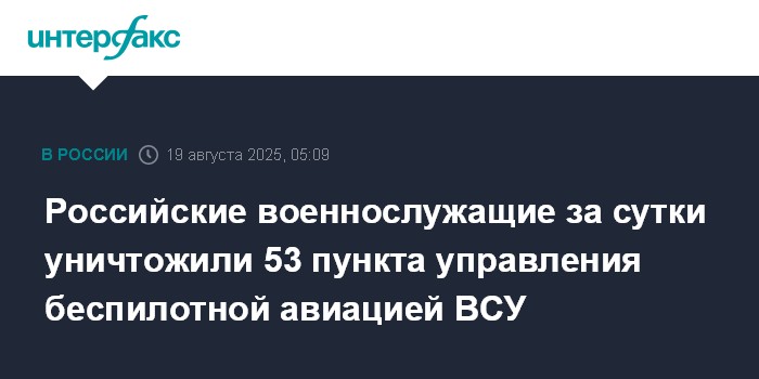 Москва. 19 августа. INTERFAX.RU - Военнослужащие группировок "Запад" и "Восток" за минувшие сутки уничтожили в зоне проведения специальной военной операции 53 пункта управления БПЛА вооружённых сил Украины, сообщили во вторник представители группировок.