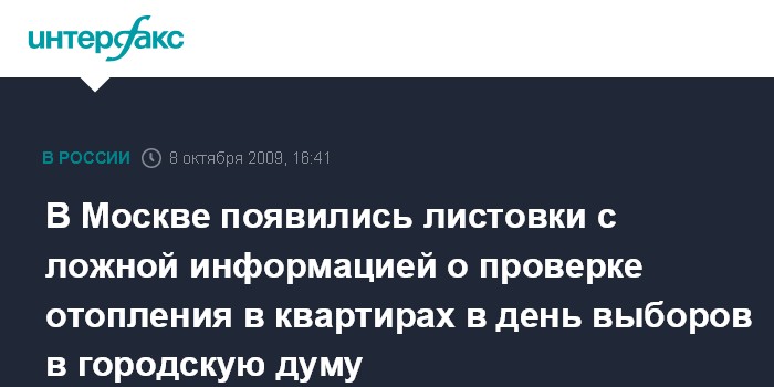 Москва. 8 октября. INTERFAX.RU - В некоторых районах столицы появились листовки с ложной информацией о том, что в день выборов в Мосгордуму 11 октября в квартирах москвичей будут проводиться работы по подготовке систем отопления, сообщили "Интерфаксу" в пресс-службе департамента ЖКХ и благоустройства Москвы в четверг.