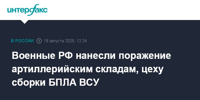 Москва. 19 августа. INTERFAX.RU - Вооружённые силы России нанесли поражение складам ракетно-артиллерийского вооружения и боеприпасов, цеху сборки беспилотных летательных аппаратов дальнего действия украинской армии, сообщило министерство обороны РФ во вторник.