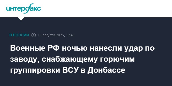 Москва. 19 августа. INTERFAX.RU - Российские военные сообщили, что минувшей ночью нанесен групповой удар по нефтеперерабатывающему заводу, снабжающему горючим группировки ВСУ в Донбассе.