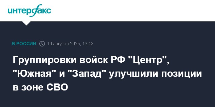 Москва. 19 августа. INTERFAX.RU - Группировки войск "Центр", "Южная", "Запад" в течение суток улучшили позиции в зоне спецоперации, "Восток" - продвигается в глубину украинской обороны, сообщило Минобороны РФ во вторник.