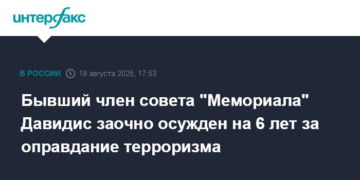 "С учетом позиции прокуратуры суд заочно приговорил одного из руководителей "Мемориала" 56-летнего Сергея Давидиса к шести годам колонии общего режима", - сказали в прокуратуре.