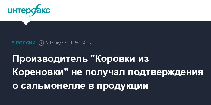 Москва. 20 августа. INTERFAX.RU - ГК "Ренна" (бренды "Коровка из Кореновки", "Алексеевское" и др.) сообщила, что не получала от российских государственных органов подтверждений факта наличия сальмонеллы в своей молочной продукции.