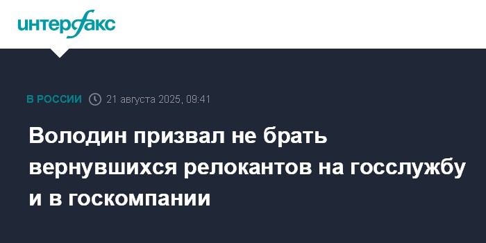 Как написал Володин в четверг в своем канале в MAX, сейчас релоканты начинают возвращаться в РФ и, "более того, в надежде трудоустроиться начинают ходить по кабинетам госкорпораций, крупных компаний, а также государственных и муниципальных учреждений".