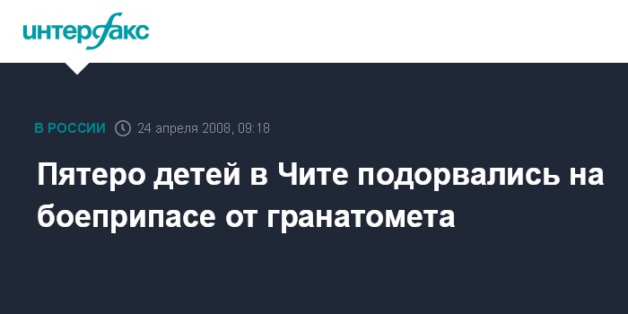 Чита. 24 апреля. INTERFAX.RU - По результатам взрывотехнической экспертизы, пятеро детей в Чите подорвались в минувший понедельник на боеприпасе от автоматического гранатомета АГС-17, сообщили в следственном отделе Черновского района Читы СУ СКП РФ по Забайкальскому краю.