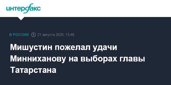 Москва. 21 августа. INTERFAX.RU - Премьер-министр Михаил Мишустин на встрече в Казани с главой Татарстана Рустамом Миннихановым пожелал ему удачи на выборах в сентябре.