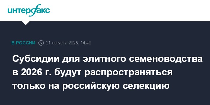 Москва. 21 августа. INTERFAX.RU - Субсидирование элитного семеноводства в РФ с 2026 года будет распространяться только на семена отечественной селекции, сообщила министр сельского хозяйства РФ Оксана Лут.