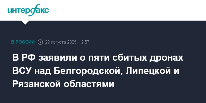 Москва. 22 августа. INTERFAX.RU - Российские военные уничтожили три украинских дрона самолетного типа над Белгородской областью и по одному над Рязанской и Липецкой областями, сообщили в Минобороны РФ в пятницу.