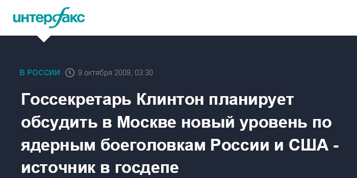 Госсекретарь Клинтон планирует обсудить в Москве новый уровень по ядерным боеголовкам России и США - источник в госдепе