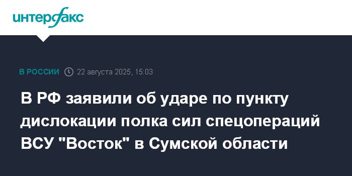 Москва. 22 августа. INTERFAX.RU - Российские военные нанесли удар авиабомбой по пункту временной дислокации полка сил специальных операций вооруженных сил Украины "Восток" в Сумской области, заявили в Минобороны РФ в пятницу.