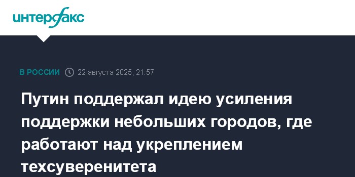 Москва. 22 августа. INTERFAX.RU - Президент РФ Владимир Путин поддержал идею разработки программы поддержки небольших городов, где работают над укреплением технологического суверенитета российские ученые. Глава государства даст соответствующее поручение.