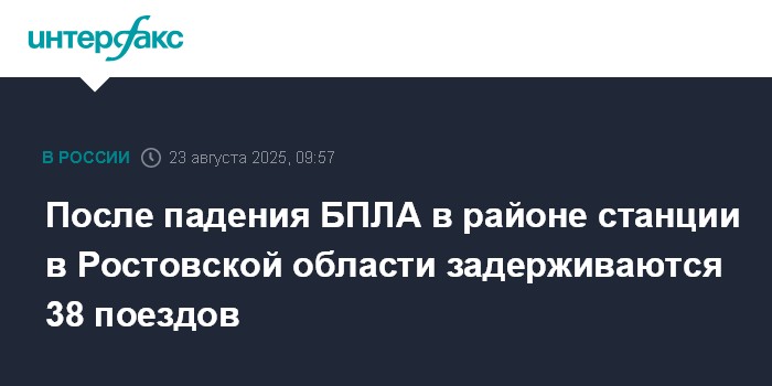Москва. 23 августа. INTERFAX.RU - 38 поездов идут с задержками до 3 часов 40 минут после падения БПЛА в районе станции Сергеевка в Ростовской области, сообщается в телеграм-канале РЖД.