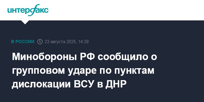 Москва. 23 августа. INTERFAX.RU - Российские военные нанесли групповой ракетный и авиационный удар комплексом "Искандер", ФАБ-500 и дронами "Герань" по пунктам временной дислокации армии Украины в ДНР, сообщили в Минобороны РФ в субботу.