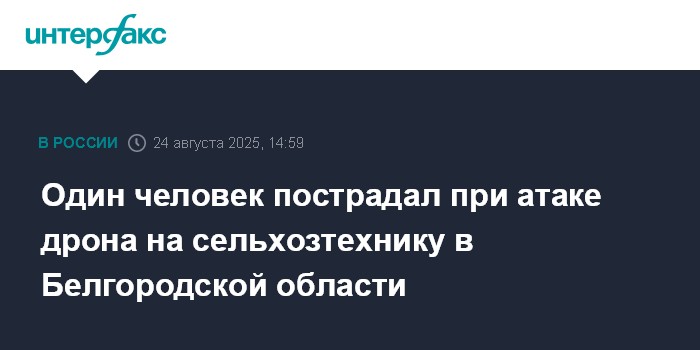 Москва. 24 августа. INTERFAX.RU - Украинский дрон атаковал работающую в поле сельхозтехнику в районе хутора Балки Шебекинского округа, пострадал мирный житель, сообщил губернатор Вячеслав Гладков.